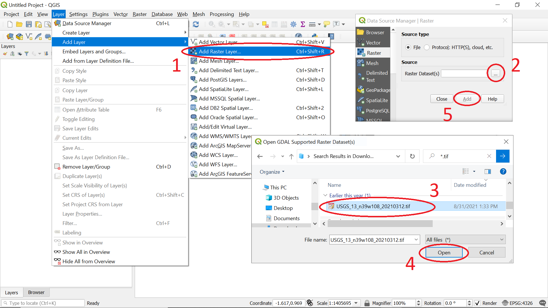 on the Download list icon ② and open the resulting text file with Notepad. We see two different web addresses. Both are for the same geographical area (one degree of latitude by one degree of longitude) but one has a newer date. We’ll plug that one into a browser to download our dataset. Note that the file is in TIFF format, easy for QGIS to digest.