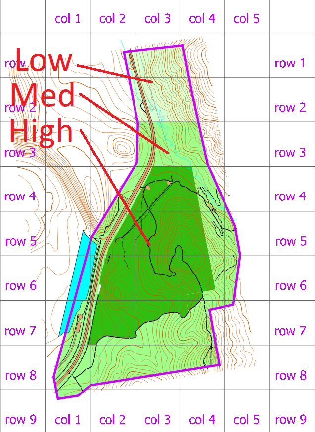 As pictured, some grid squares, or portions of grid squares, are more important than others. The High Priority areas amount to about 150 acres—concentrate on those, and we're good for our planned events!